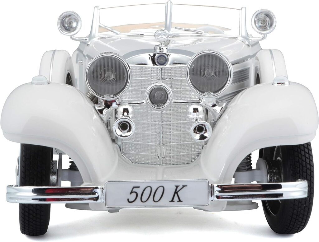 The Maisto Plastic 1:18 Scale 1936 M-B 500 K Type Specialroadster Diecast Vehicle in White offers excellent value for car enthusiasts and collectors. Its highly detailed design, realistic features, and sturdy construction make it a worthwhile investment. Whether you’re adding it to your collection, using it for educational purposes, or simply appreciating its beauty, this diecast vehicle delivers on both quality and visual appeal.